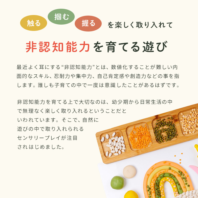 スコップやトング、おうちにある容器やおもちゃを使ってすぐに遊べる、感覚遊び。